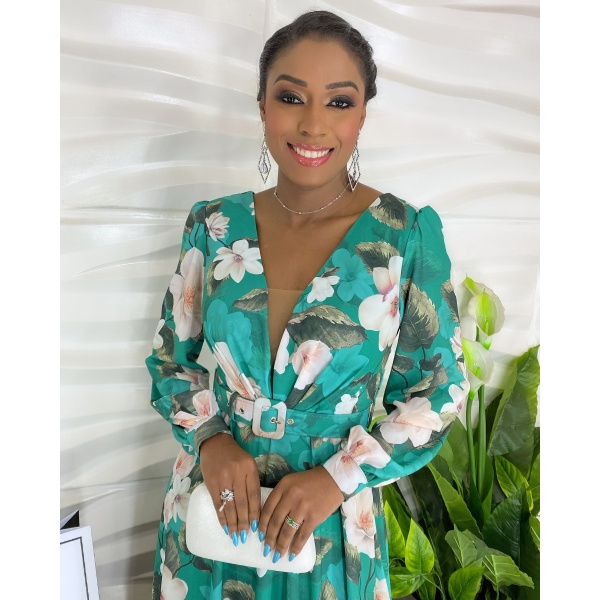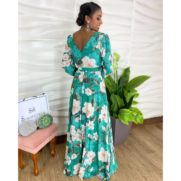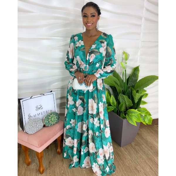 Vestido longo verde esmeralda floral com cinto. Um arraso!
