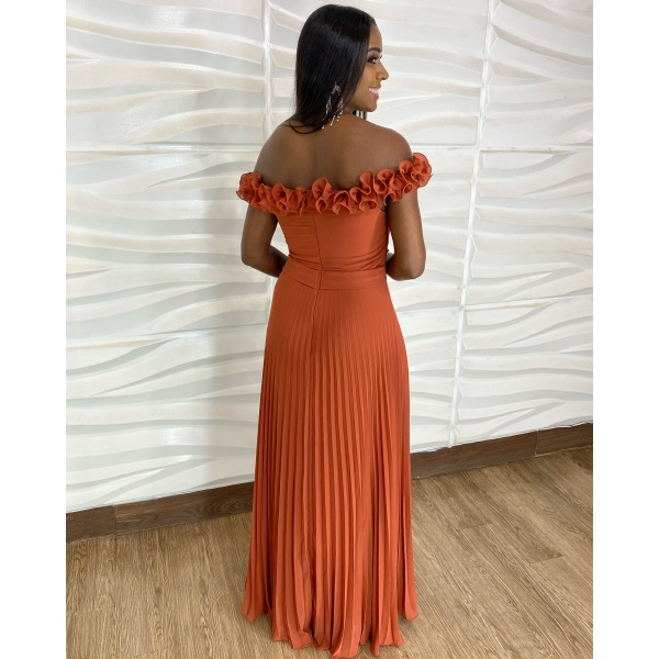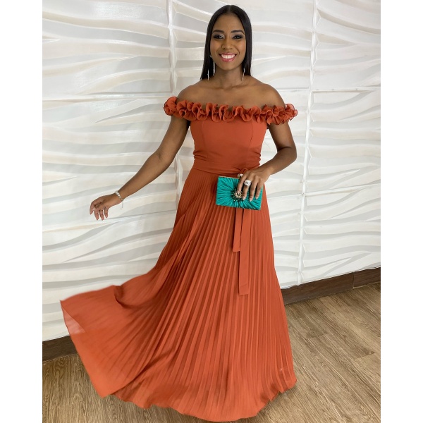 👗Vestido longo terracota ombro a ombro com aplicação, faixa cintura e saia plissada em crepe. Um arraso!