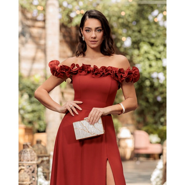 👗Vestido longo terracota ombro a ombro com aplicação, faixa cintura e fenda em crepe. Um arraso!