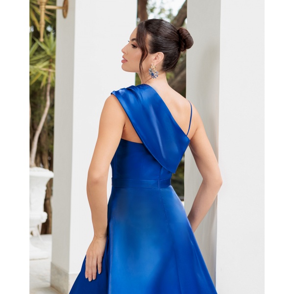 👗Vestido longo azul royal ombro só com pala e fenda em zibeline glow. Maravilhoso!