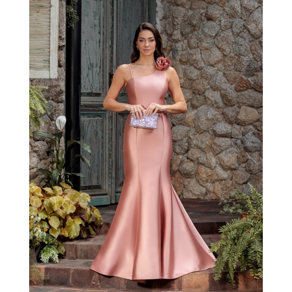 👗vestido longo rosé semi sereia ombro só com flor em zibeline. Maravilhoso!