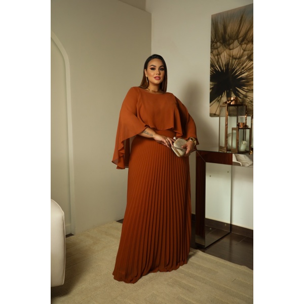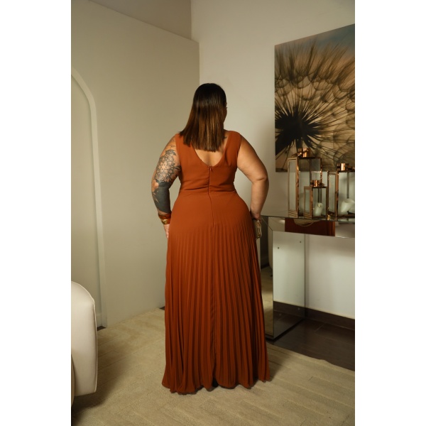 👗Vestido plus size terracota 2x1 em crepe, alça larga com saia plissada e capa removível. Um arraso!