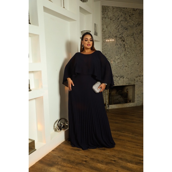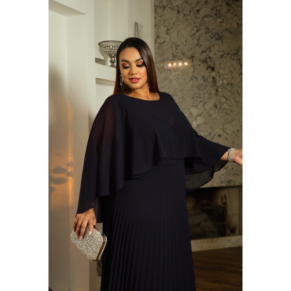 👗Vestido plus size azul marinho 2x1 em crepe, alça larga com saia plissada e capa removível. Um arraso!
