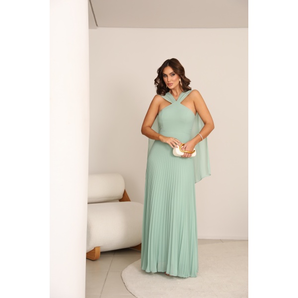👗Vestido longo verde menta amarração pescoço saia plissada em crepe. Um arraso!