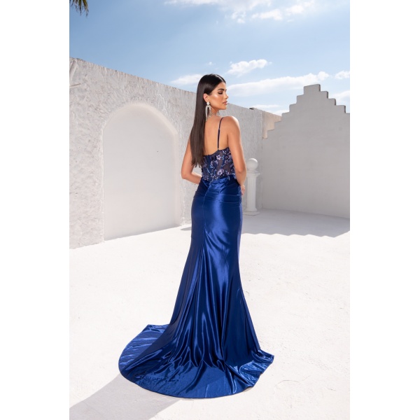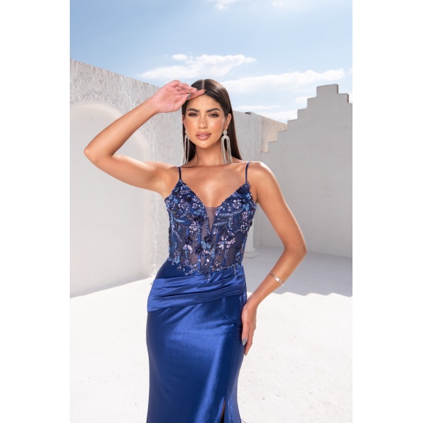 👗Vestido longo bordado azul marinho busto flor drapeado cintura saia cetim. O vestido dos sonhos!