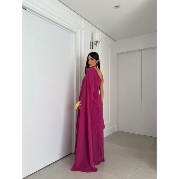 👗Vestido longo fúcsia ombro só com fivela 3 camadas em crepe. Um arraso!