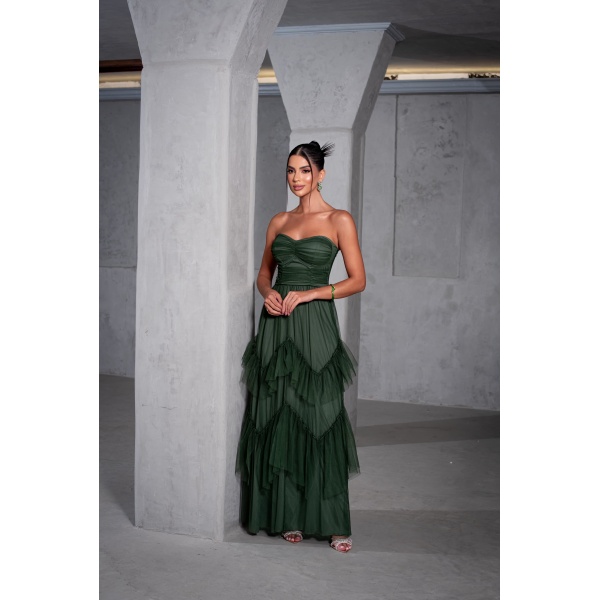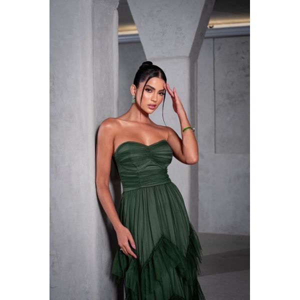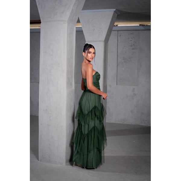 👗Vestido longo verde oliva tomara que caia saia camadas em tule. Um arraso!