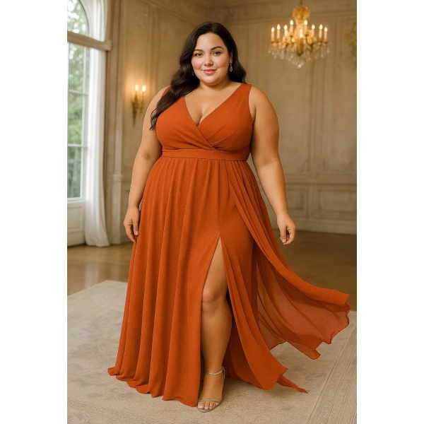 👗Vestido plus size terracota alça larga fenda em lurex. Lindo demais né?