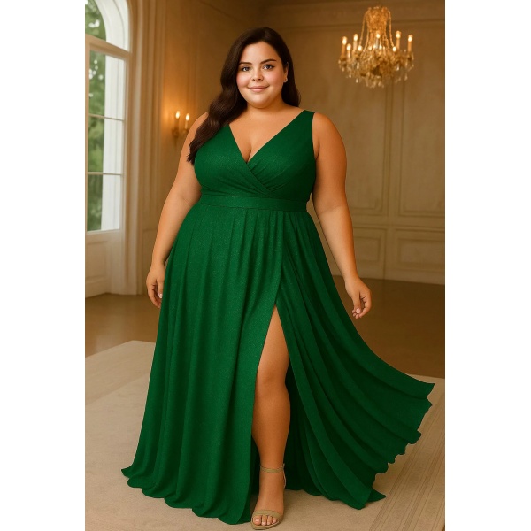 👗Vestido plus size verde esmeralda alça larga fenda em lurex. Lindo demais né?