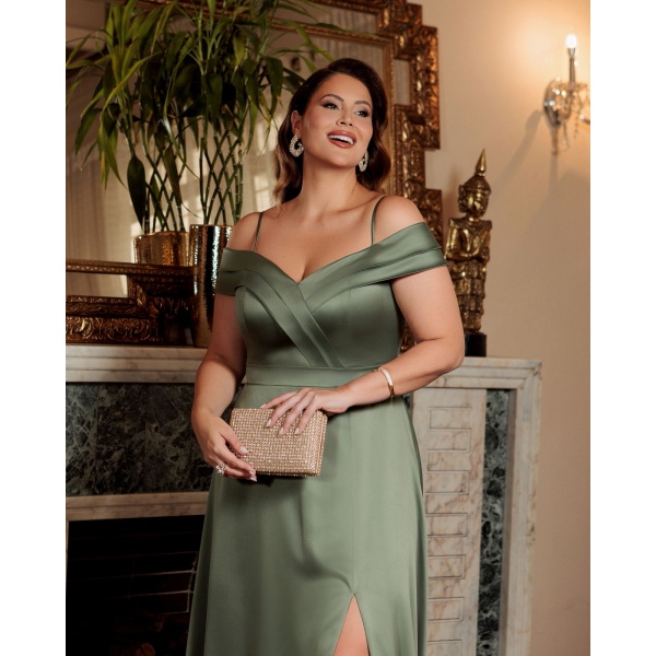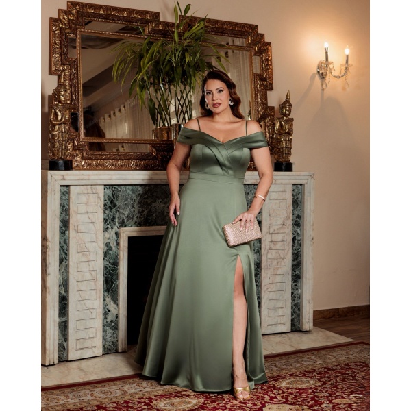 vestido plus size verde oliva ombro a ombro fenda em crepe prada. Maravilhoso!