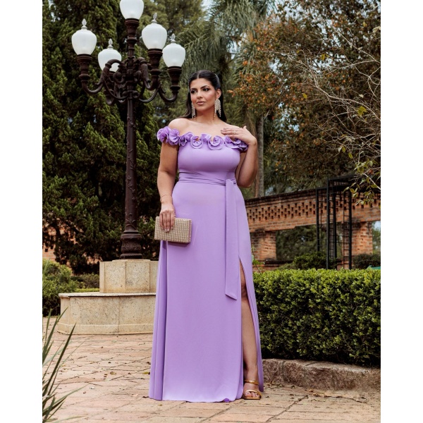 👗Vestido plus size lilás ombro a ombro com aplicação, faixa cintura e fenda em crepe. Um arraso!