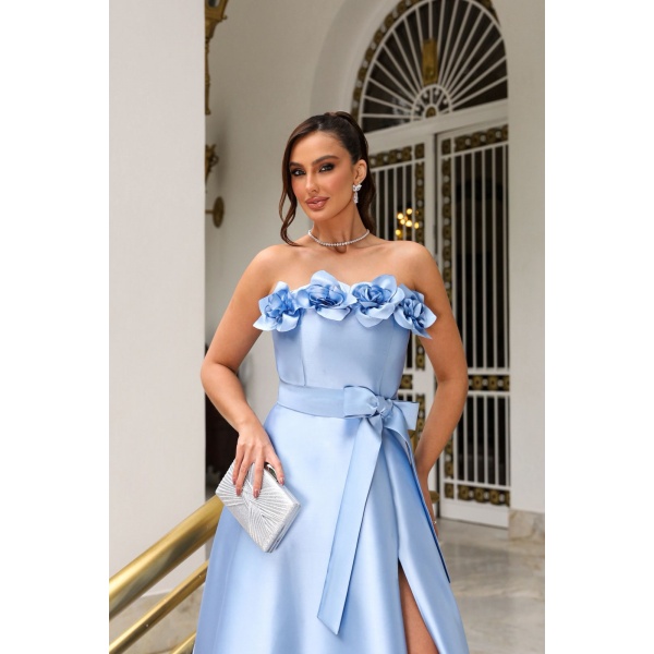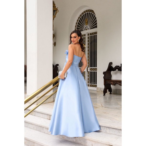 👗Vestido longo azul serenity tomara que caia flor busto, faixa cintura e fenda em zibeline. maravilhoso