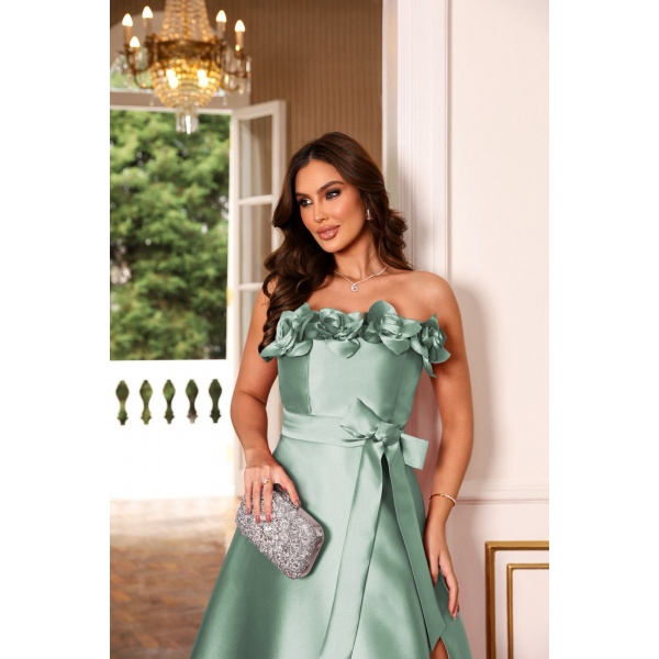 👗Vestido longo verde menta tomara que caia flor busto, faixa cintura e fenda em zibeline. maravilhoso