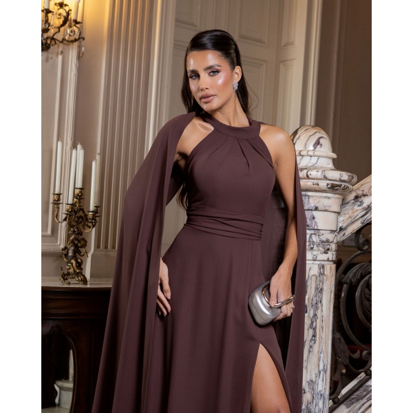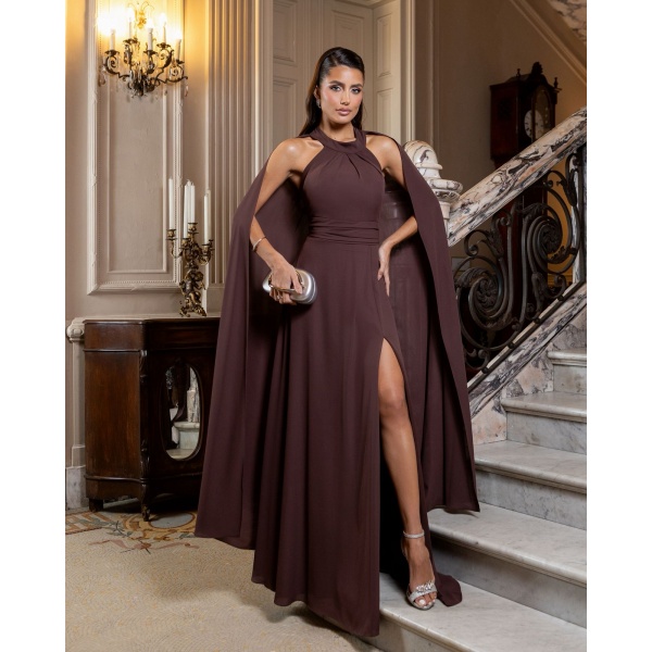 👗Vestido longo marrom gola alta cap dress faixa cintura e fenda em crepe. Um arraso!