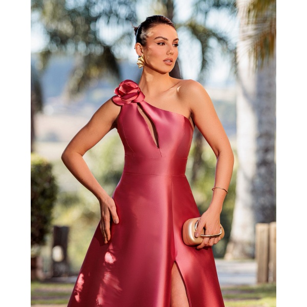 👗Vestido longo rosa queimado ombro só flor abertura busto e fenda em zibeline. Um arraso!