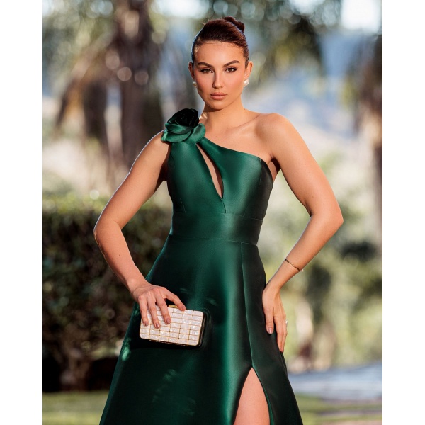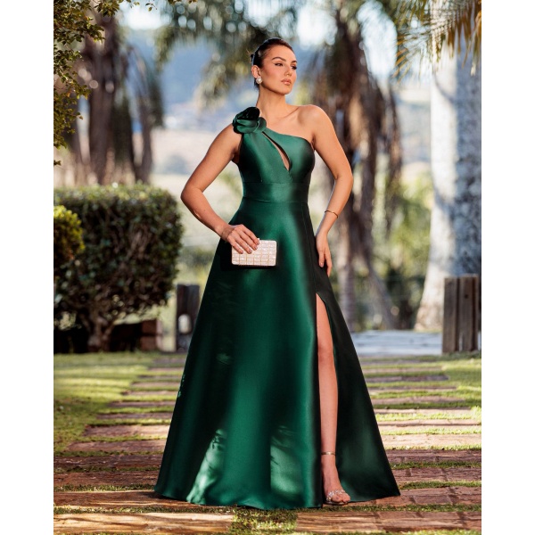 👗Vestido longo verde esmeralda ombro só flor abertura busto e fenda em zibeline. Um arraso!