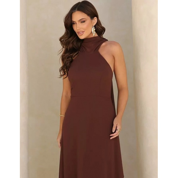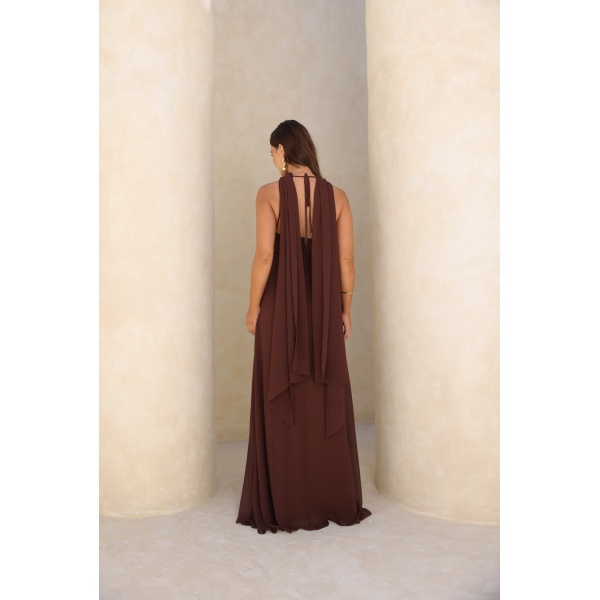 👗Vestido longo marrom cap dress amarrar pescoço saia evasê em crepe. Um arraso!