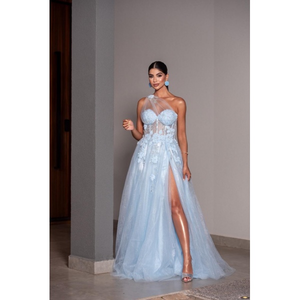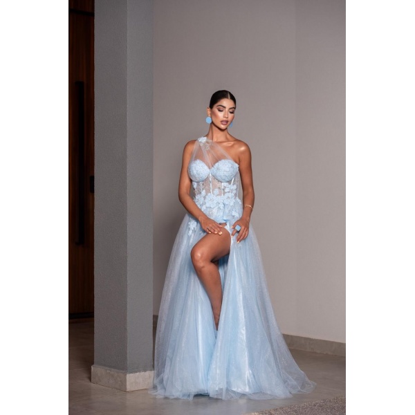 👗Vestido longo bordado azul serenity um ombro so com saia em tule e fenda. O vestido dos sonhos!