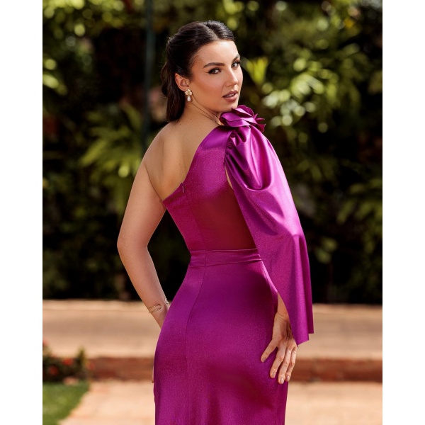 👗Vestido longo semi sereia um ombro so em crepe acetinado com detalhe de flor manga capa e fenda. Um arraso!