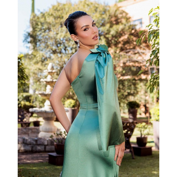 👗Vestido longo semi sereia um ombro so em crepe acetinado com detalhe de flor manga capa e fenda. Um arraso!