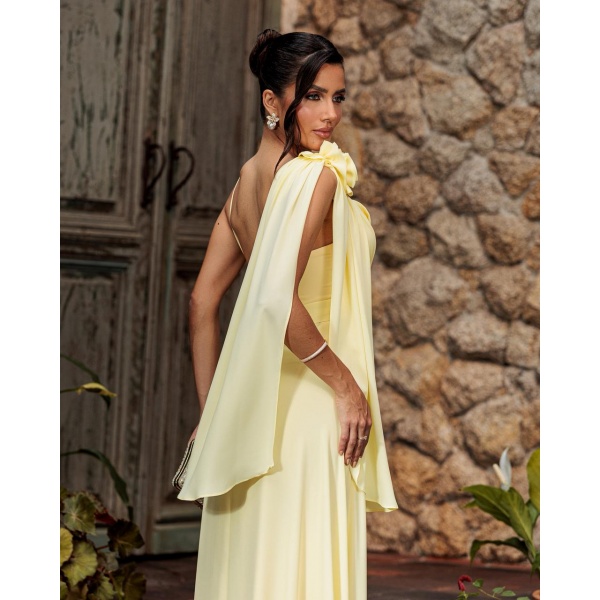 👗Vestido longo em crepe com saia fluida busto drapeado alcinhas e detalhe de flor no ombro com manga capa. Lindissimo!