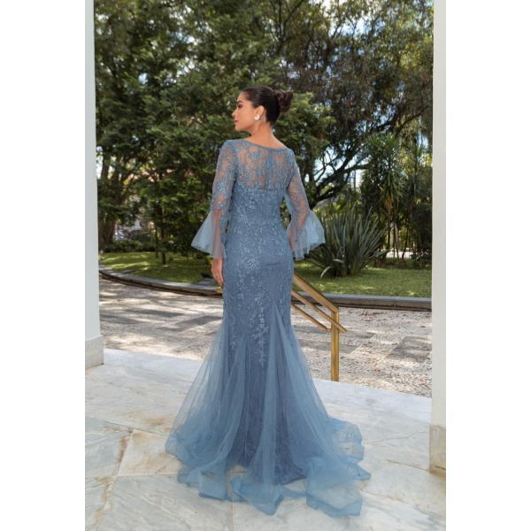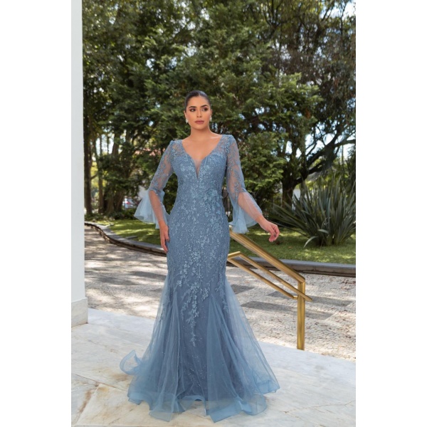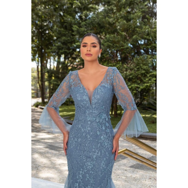 👗Vestido longo bordado azul semi sereia meia manga. O vestido dos sonhos!