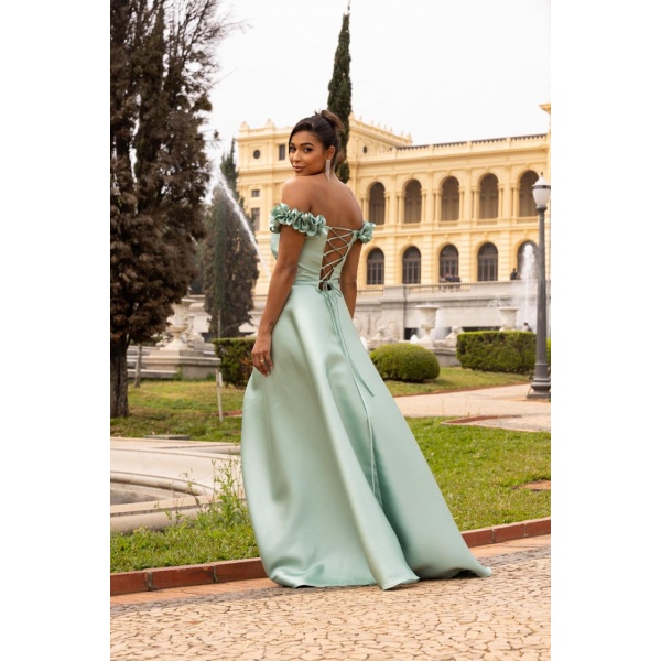 vestido verde menta ombro a ombro com aplique costas trançadas e fenda em zibeline. Maravilhoso!