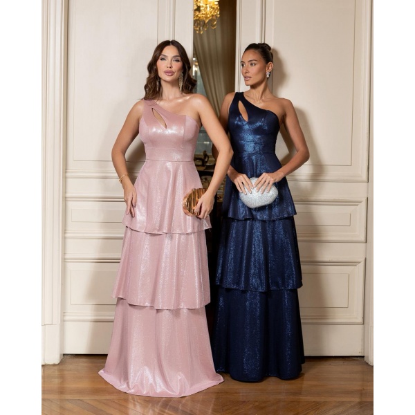 vestido azul marinho ombro só saia babado lurex. Maravilhoso!