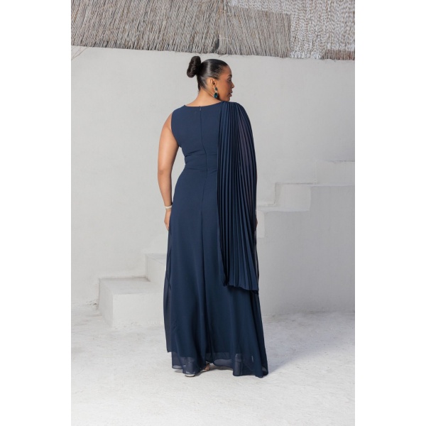 vestido azul marinho alça larga lado plissado em crepe. Maravilhoso!