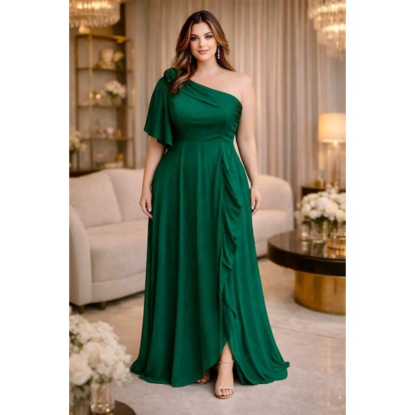👗Vestido plus size verde esmeralda ombro só babado fenda lurex. Lindo demais né?