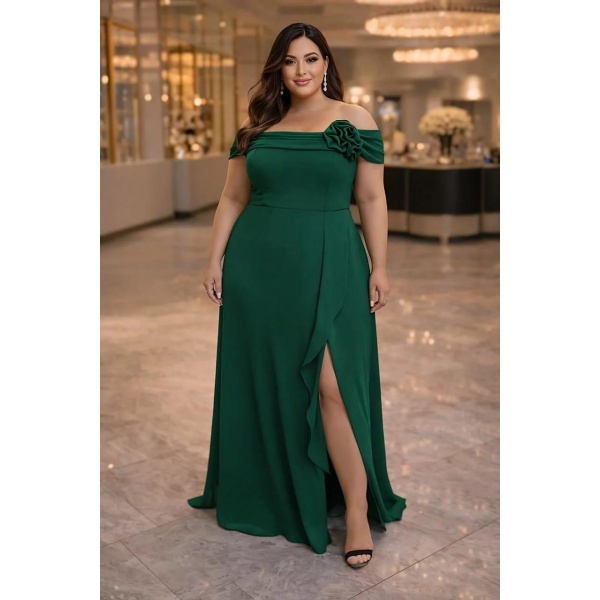 👗Vestido plus size verde esmeralda ombro a ombro flor e fenda em crepe. Lindo demais né?