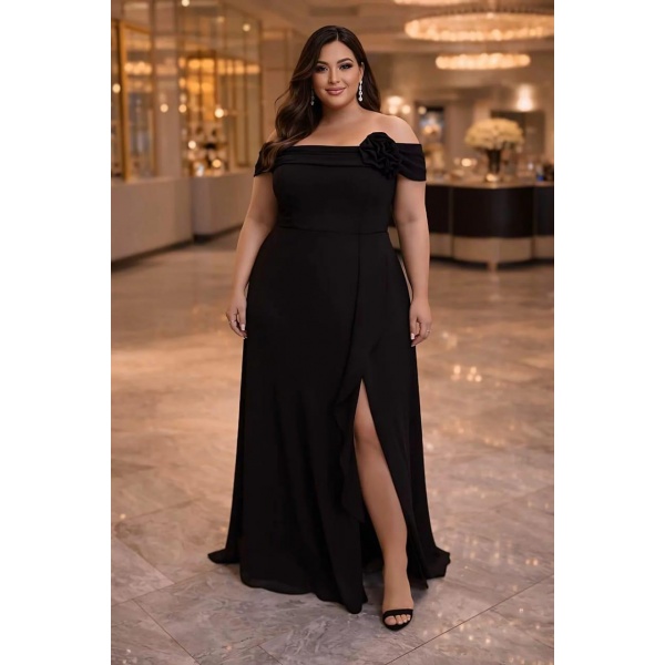 👗Vestido plus size preto ombro a ombro flor e fenda em crepe. Lindo demais né?