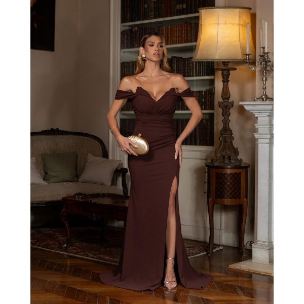 👗Vestido longo marrom semi sereia drapeado cintura e fenda em crepe com elastano. Maravilhoso!