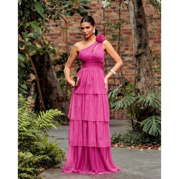 👗Vestido longo fúcsia ombro só flor três marias busto vazado lurex. Lindo demais né?