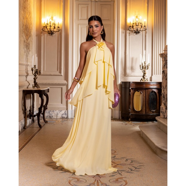 👗Vestido longo amarelo amarrar pescoço e flor em musseline. Lindo demais né?