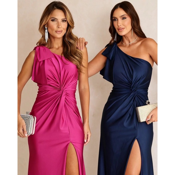 👗Vestido longo azul marinho ombro só laço e nó cintura fenda em trilobal. Lindo demais né?