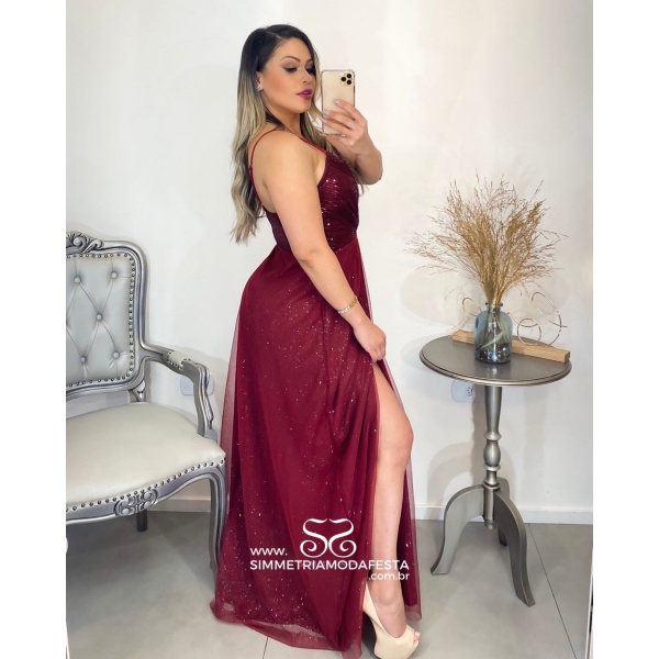👗Vestido longo marsala busto em paetês e saia em tule com brilho. Um arraso!