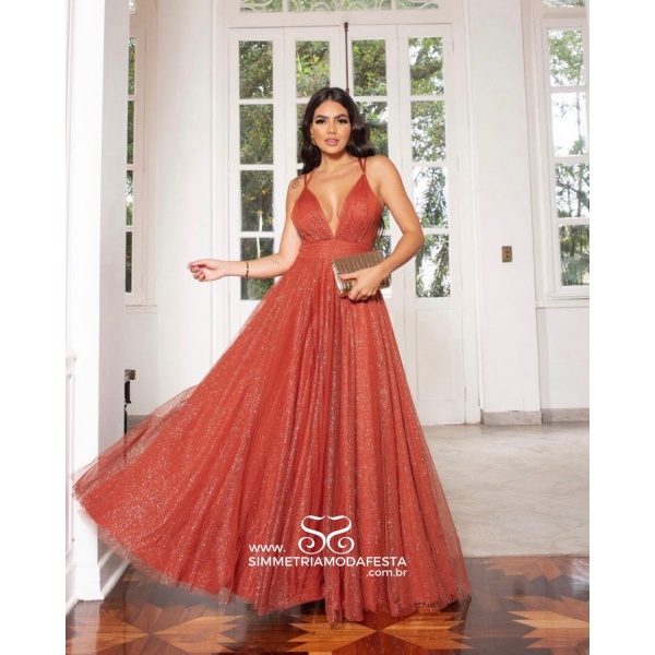 👗Vestido longo terracota decote v com saia evasê e costas cruzadas em lurex. Lindo demais né?