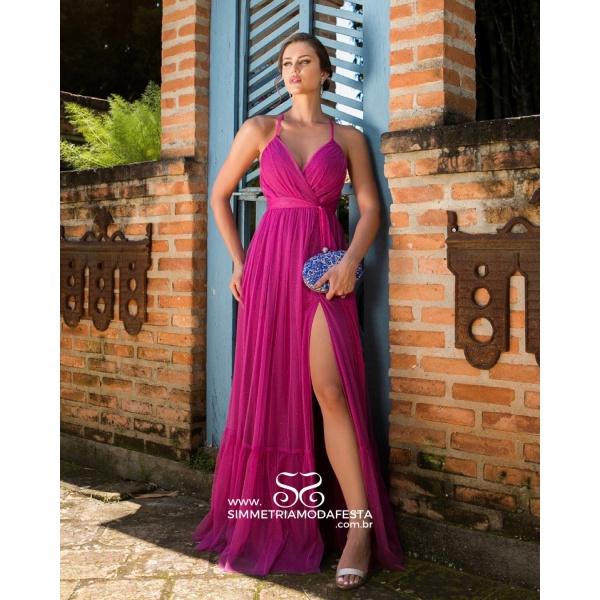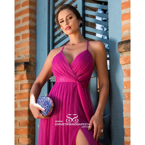 👗Vestido longo fúcsia alça fina busto transpassado com faixa na cintura e costas cruzadas em lurex. Lindo demais né?