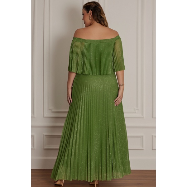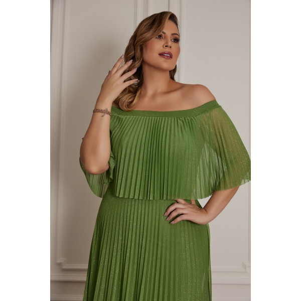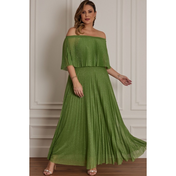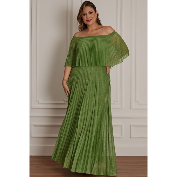 👗 Vestido longo plus size verde oliva ombro a ombro inteiro plissado em lurex. Um arraso né?