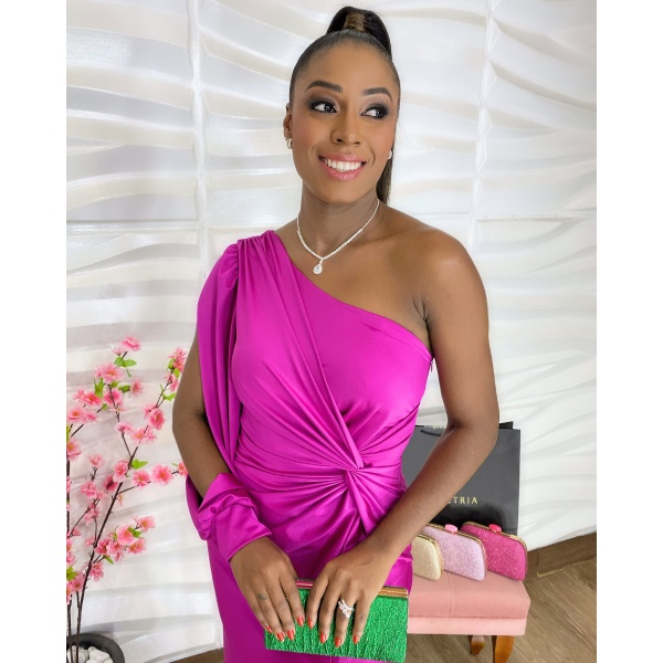 👗Vestido longo fúcsia manga longa ombro só com nó na cintura em crepe acetinado. Um arraso!