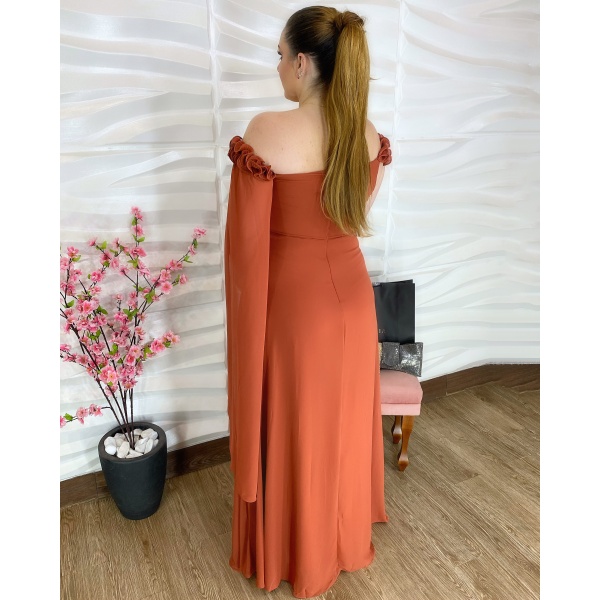 👗Vestido longo terracota em crepe ombro a ombro com aplicação e manga capa lateral com abertura. Um arraso!