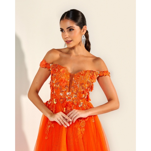 👗Vestido bordado laranja busto flores saia tule. Um arraso!