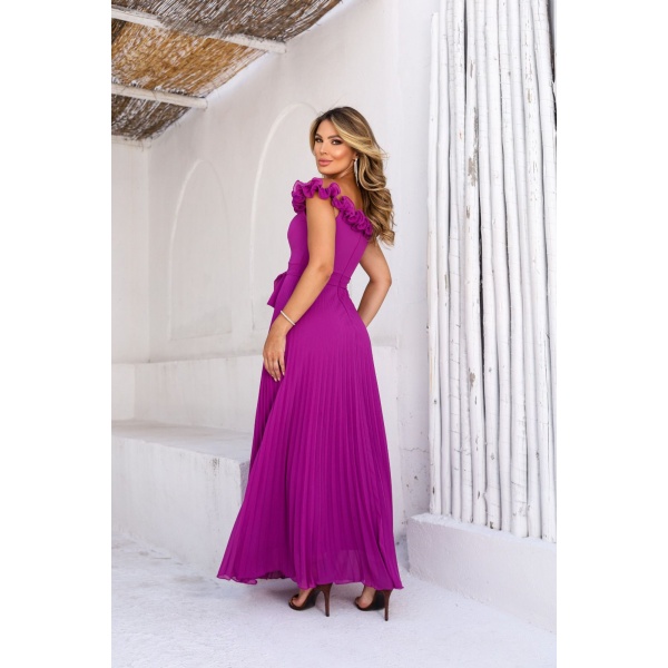 👗Vestido longo fúcsia ombro a ombro com aplicação, faixa cintura e saia plissada em crepe. Um arraso!