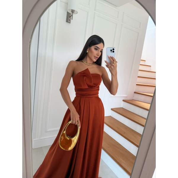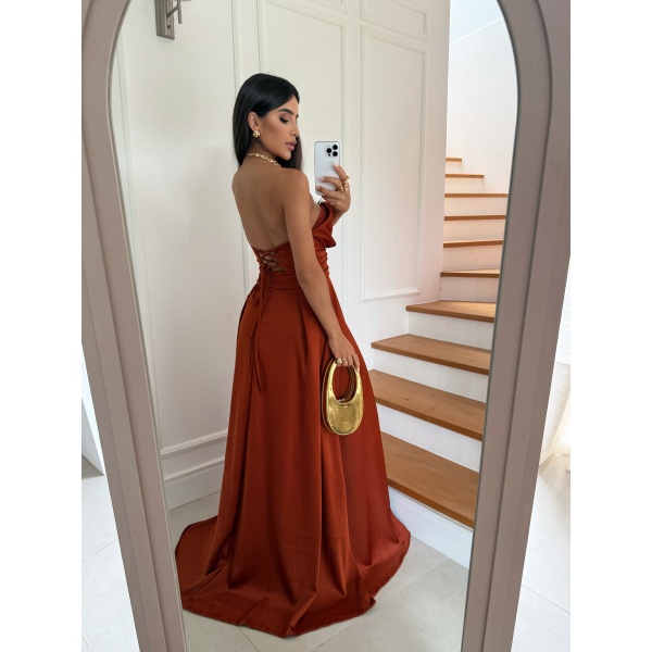 👗Vestido longo terracota tomara que caia faixa cintura fenda em crepe prada. Um arraso!
