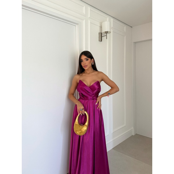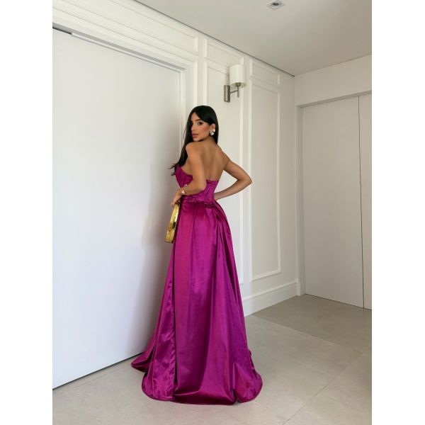 👗Vestido longo fúcsia tomara que caia drapeado busto saia evasê em crepe prada. Um arraso!