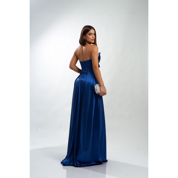 👗Vestido longo azul royal tomara que caia drapeado busto saia evasê em crepe prada. Um arraso!