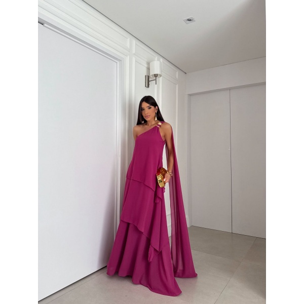 👗Vestido longo fúcsia ombro só com fivela 3 camadas em crepe. Um arraso!
