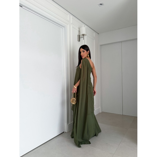 👗Vestido longo verde oliva ombro só com fivela 3 camadas em crepe. Um arraso!