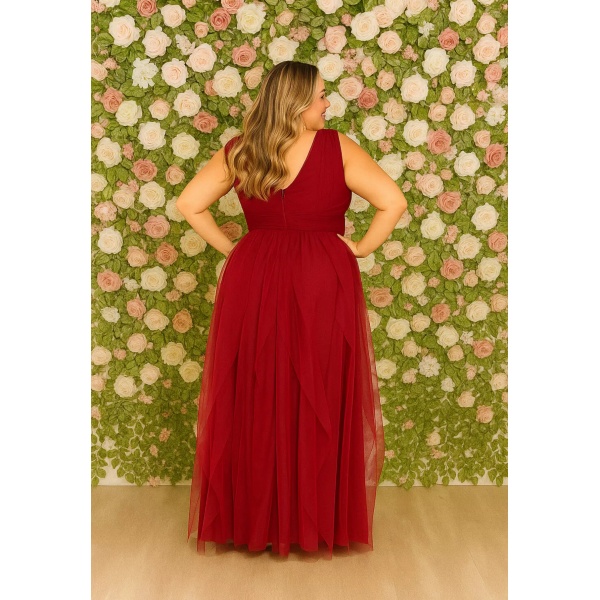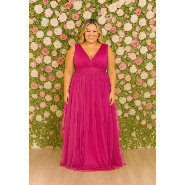 👗Vestido plus size fúcsia saia camadas em tule. Lindo demais né?